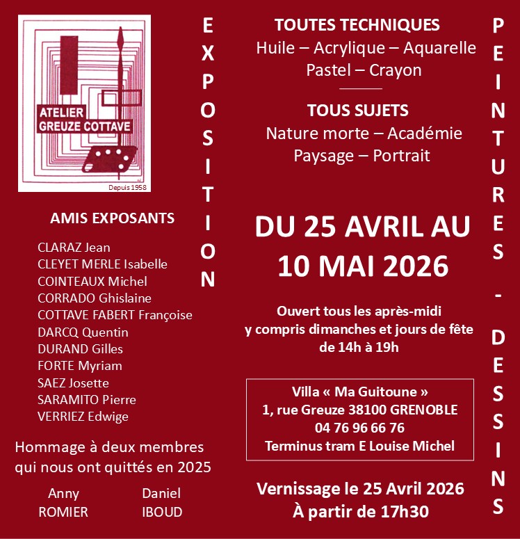 Exposition de l'Atelier Greuze Cottave, 1 rue Greuze à Grenoble. Du 25 avril au 10 mai 2026, exposition ouverte tous les jours de 14h à 19h, y compris dimanches et fêtes.
